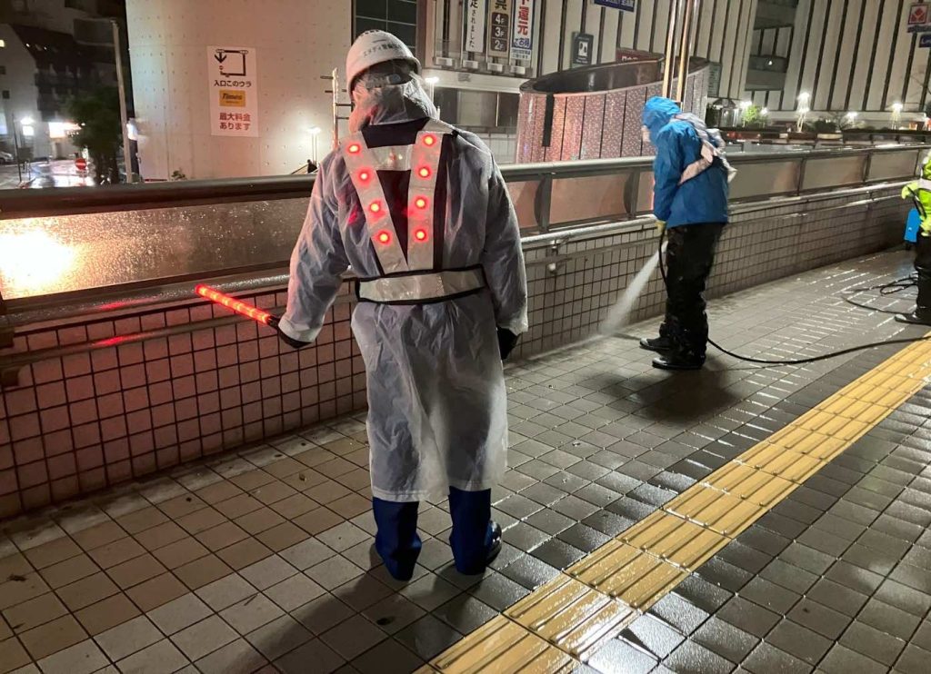 ・高所作業車、高圧洗浄機等を用い、安全管理に徹した夜間作業